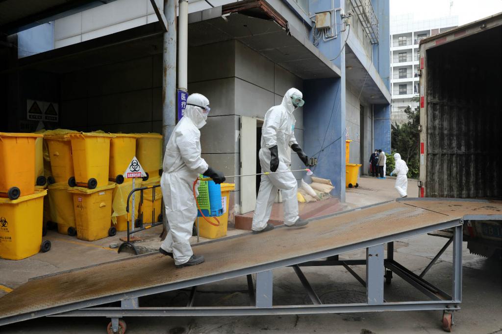 ▲卸完醫(yī)療廢物后,工作人員對堆放區(qū)域進(jìn)行消毒。