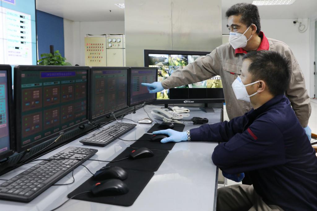 ▲工作人員通過實(shí)時影像監(jiān)測醫(yī)療廢物處置過程。
