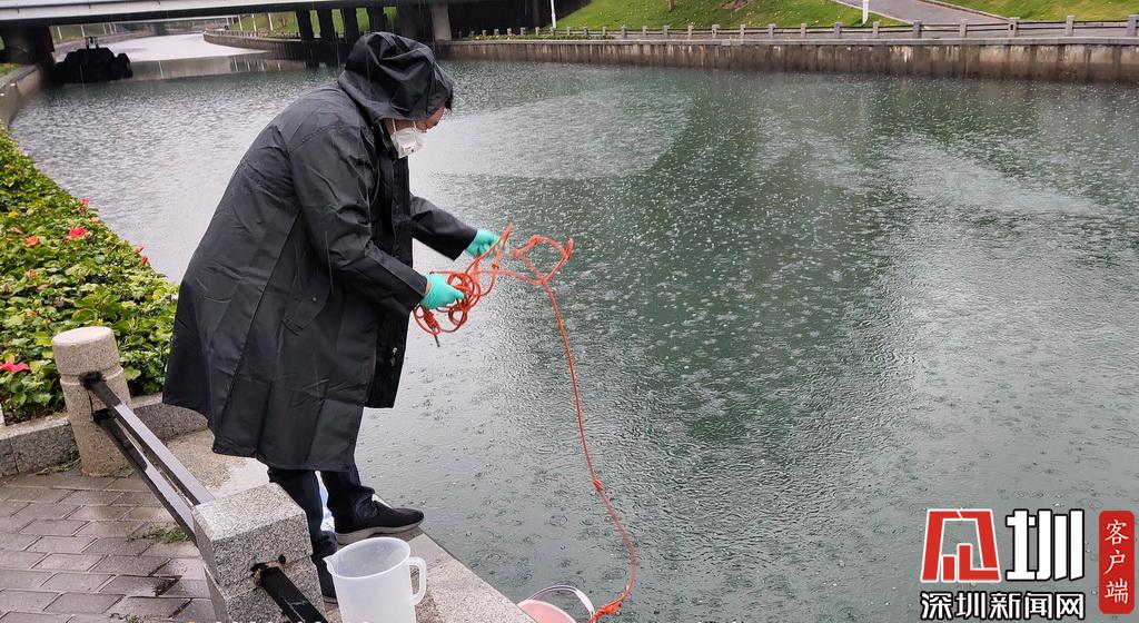 雨天,市環(huán)境監(jiān)測(cè)中心站的監(jiān)測(cè)人員在南山區(qū)大沙河取樣,進(jìn)行水質(zhì)監(jiān)測(cè)。