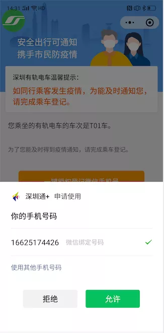 第一步:乘客使用微信掃描列車車廂內(nèi)的登記碼,登記頁面會(huì)自動(dòng)顯示上次登記的手機(jī)號(hào)或在“深圳通+”小程序中注冊的手機(jī)號(hào)碼:
