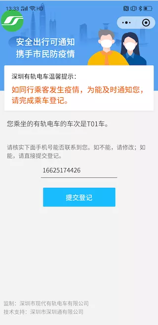 第一步:乘客自己完成乘車登記后,再次使用微信掃描列車車廂內(nèi)的登記碼,會(huì)出現(xiàn)如下頁面,自動(dòng)顯示上次登記的手機(jī)號(hào):