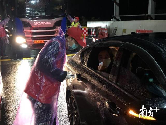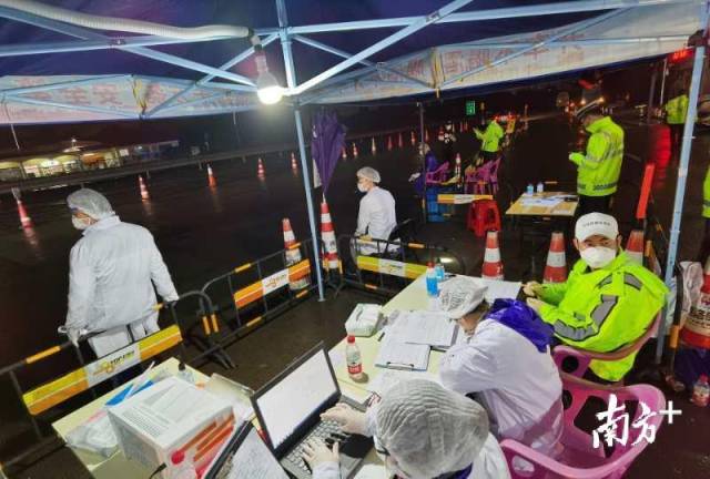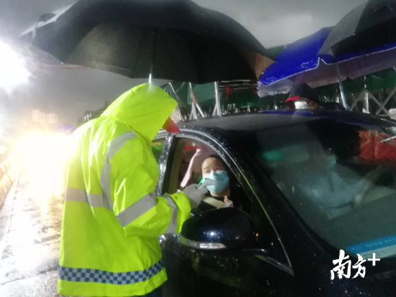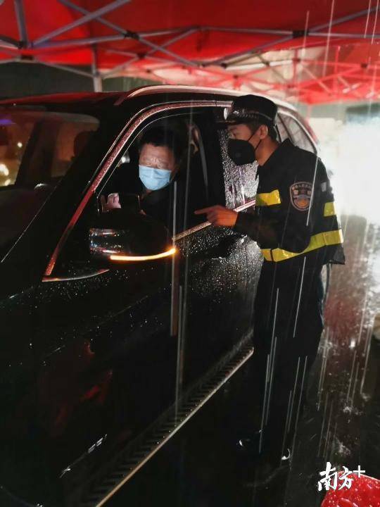 龍城街道黨員干部、工作人員與龍崗區(qū)退役軍人義工隊(duì)、龍崗交警組成防控隊(duì)伍,借助現(xiàn)場高速雨棚的遮擋,對進(jìn)深車輛一一進(jìn)行排查。