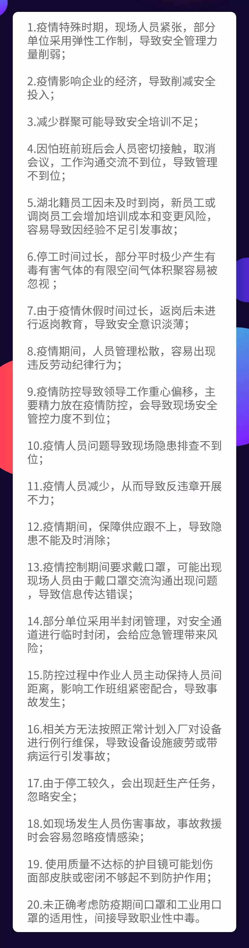 疫情防控和節(jié)后復產(chǎn)復工給企業(yè)安全生產(chǎn)帶來新挑戰(zhàn),如何做好防控措施?哪些風險又要防范?員工又如何自我保護?