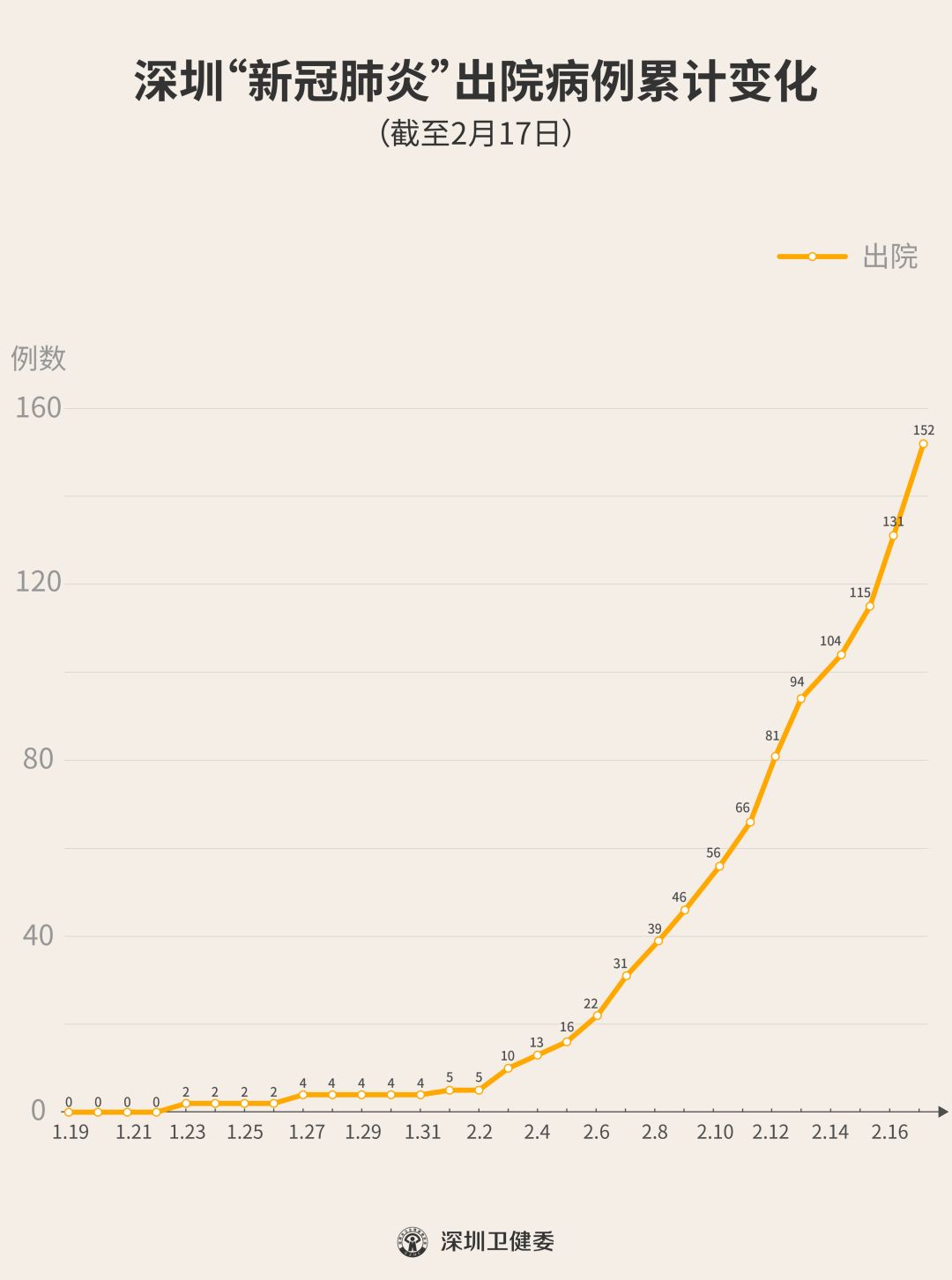 2月17日下午,經(jīng)專家組會診,深圳再有21名新型冠狀病毒肺炎確診患者出院,累計達152人,連續(xù)15天有人出院。