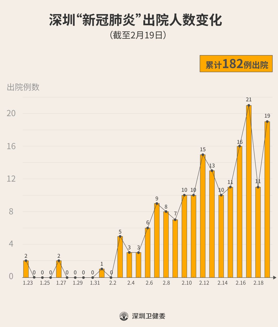 2月19日下午,經(jīng)專家組會診,深圳再有19名新型冠狀病毒肺炎確診患者出院,累計(jì)達(dá)182人,連續(xù)17天有人出院。