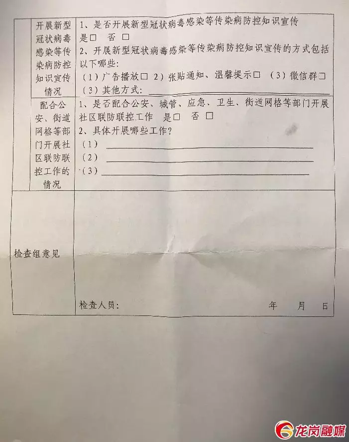 A:區(qū)住建局11組檢查人員都手握一張《龍崗區(qū)物業(yè)服務(wù)企業(yè)新型冠狀病毒防控工作檢查表》,其中按照“物業(yè)服務(wù)企業(yè)對企業(yè)從業(yè)人員的疫情防控情況”“口罩、手套等一次性衛(wèi)生用品專用垃圾桶的設(shè)置情況”“物業(yè)服務(wù)企業(yè)防疫責任落實情況”“開展新型冠狀病毒感染等傳染病防控知識宣傳情況”“配合公安、街道網(wǎng)格等部門開展社區(qū)聯(lián)防聯(lián)控工作情況”等五大類17條檢查內(nèi)容展開檢查,視情況評定“紅榜”或“黑榜”。