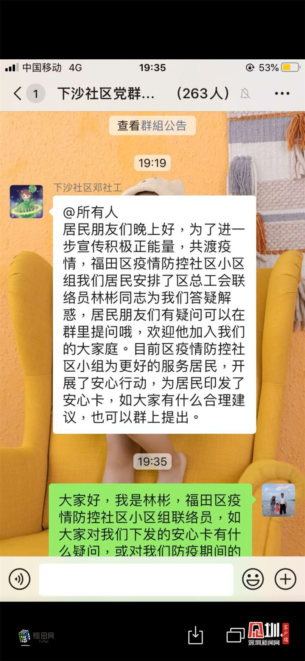 針對居民最關(guān)心自己居住的小區(qū)是否有確診病例、有無疑似病例、有無居家隔離人員的困惑,特別是出現(xiàn)了確診病例小區(qū)的居民更迫切想了解本小區(qū)采取了哪些防疫措施保證居民安全。福田區(qū)安心行動第一條就是實(shí)施小區(qū)(村)疫情防控每日一播報(bào)機(jī)制,每個重點(diǎn)小區(qū),工作組安排一名處級干部和一名科級干部化身安心聯(lián)絡(luò)員,進(jìn)到小區(qū)業(yè)主群,督促配合小區(qū)物業(yè)管理處按指定模板公告今日疫情防控播報(bào),保障居民知情權(quán),同時聽取收集居民對防疫的意見建議,協(xié)調(diào)聯(lián)系解決,并反饋落實(shí)結(jié)果,對不能馬上解決的做好解釋說明。