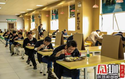 餐廳已經(jīng)見(jiàn)不到過(guò)去熱鬧的場(chǎng)景,員工們都按照地上間隔1米的“黃格子”保持著安全距離,全程沒(méi)有太多的交流。餐桌也被用擋板進(jìn)行隔離,一人一桌,同向就坐,就餐完畢還有餐廳員工對(duì)桌面進(jìn)行消殺。