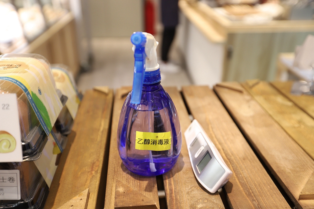 負(fù)二樓的喜薈萃是一家剛開業(yè)沒多久的面包店,記者看到里面燈光明亮、各式面包充盈貨賀,進(jìn)店的通道已全部攔堵,并設(shè)置了取餐及消毒區(qū)。一名市民正在選購面包,他站在店外選好款式后,店員將面包打包好并放在取餐處,市民掃碼付款后就可以帶走了。這就是商場內(nèi)實(shí)行的“零接觸”購物。