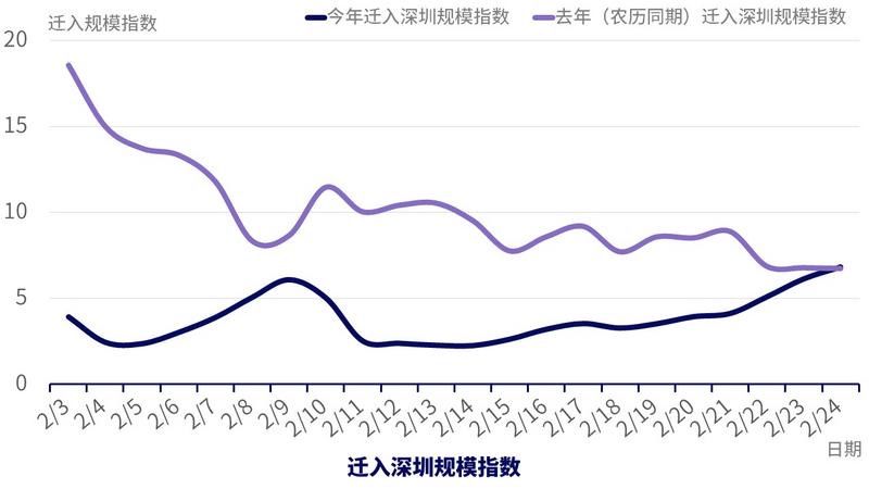 從百度遷徙地圖看到,2月21日起,深圳已連續(xù)4天居全國熱門遷入地榜首,同時,遷入規(guī)模指數(shù)也逐漸接近去年農(nóng)歷同期水平。