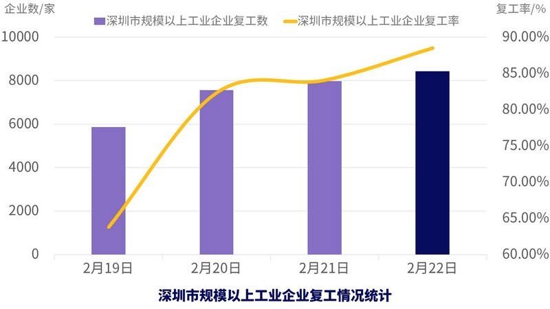 2月20日,深圳單日復(fù)工企業(yè)數(shù)超1萬6千家,較前一天增長23%,規(guī)模以上企業(yè)復(fù)工數(shù)也增長了近30%。2月21日,全市累計(jì)復(fù)工企業(yè)超10萬家,增速近20%,同時,全市規(guī)模以上企業(yè)復(fù)工率超80%。2月22日,復(fù)工企業(yè)單日再添1萬多家,全市企業(yè)復(fù)工快速有序地進(jìn)行中。