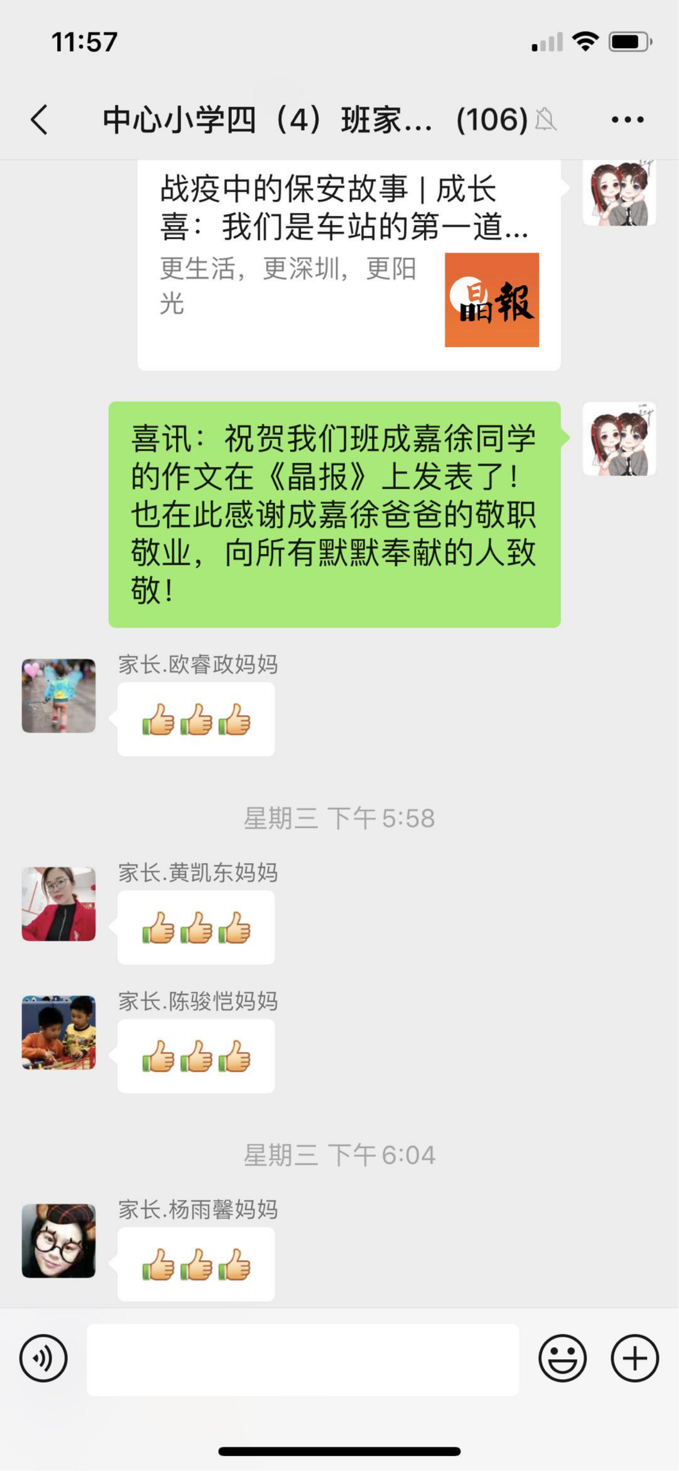 因?yàn)榫W(wǎng)課,班里的學(xué)生有了很多新體驗(yàn),比如嘗試自己做一頓飯,自制放大鏡,和父母一起運(yùn)動鍛煉等?!坝形粚W(xué)生寫了一篇講述他爸爸在抗疫一線忙碌工作的作文,發(fā)給我看讓我指導(dǎo),后來作文在《晶報(bào)》上登了出來,我又把作文發(fā)到班級群里分享,讓大家學(xué)習(xí)這位同學(xué),學(xué)習(xí)他爸爸這種舍小家顧大家的行為,很多家長看到了都為他們點(diǎn)贊?!?/p>