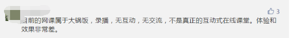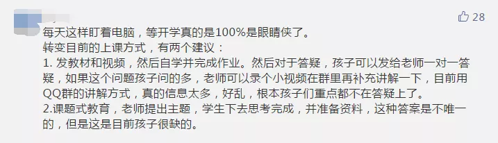 此外,22%的參與者認(rèn)為,網(wǎng)課缺乏教學(xué)氛圍,無(wú)法真正實(shí)現(xiàn)互動(dòng)式在線課堂。有家長(zhǎng)認(rèn)為,目前老師用群進(jìn)行講解,聊天消息過(guò)多,信息雜亂,老師無(wú)法及時(shí)答疑,建議老師通過(guò)小視頻等形式將熱點(diǎn)問(wèn)題再進(jìn)行補(bǔ)充講解。