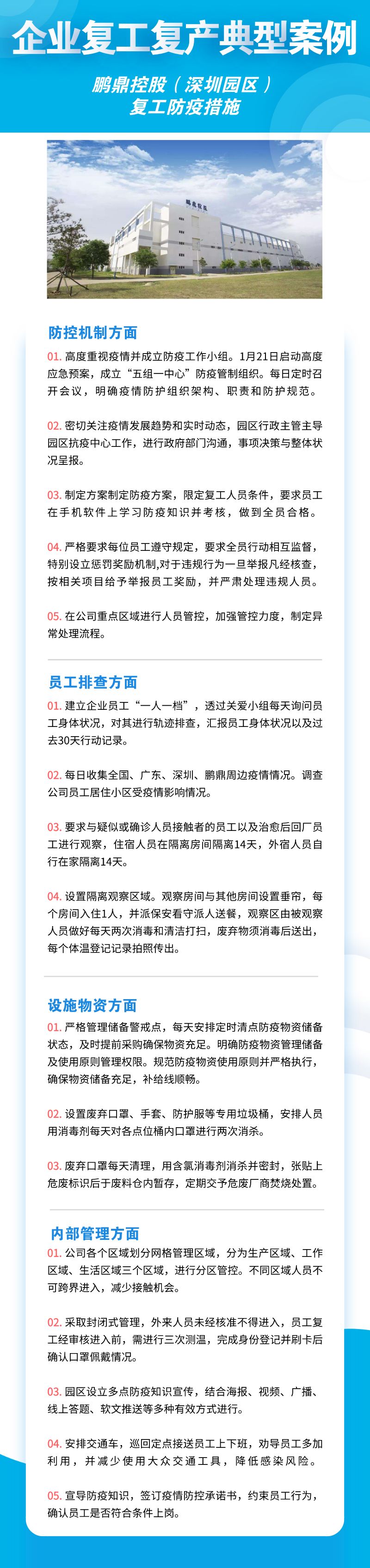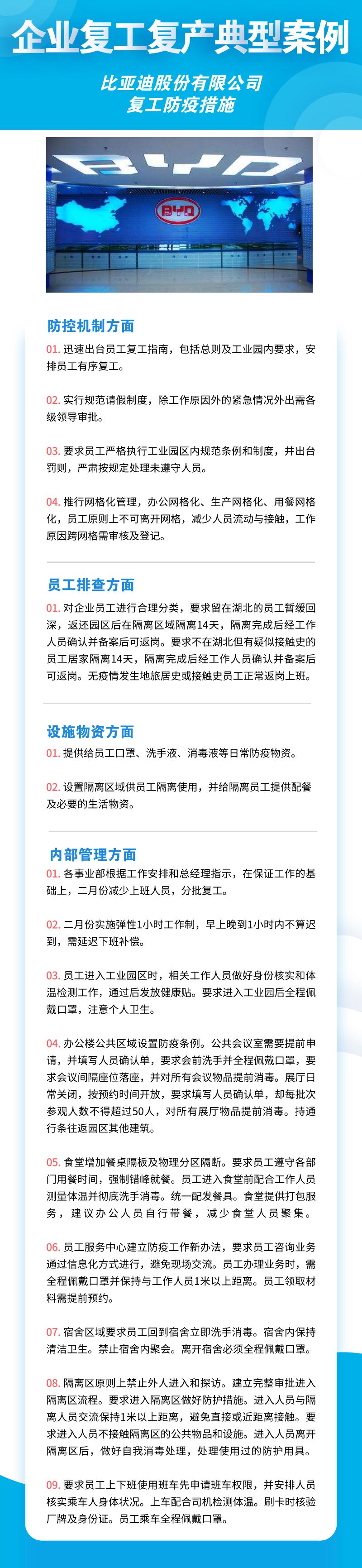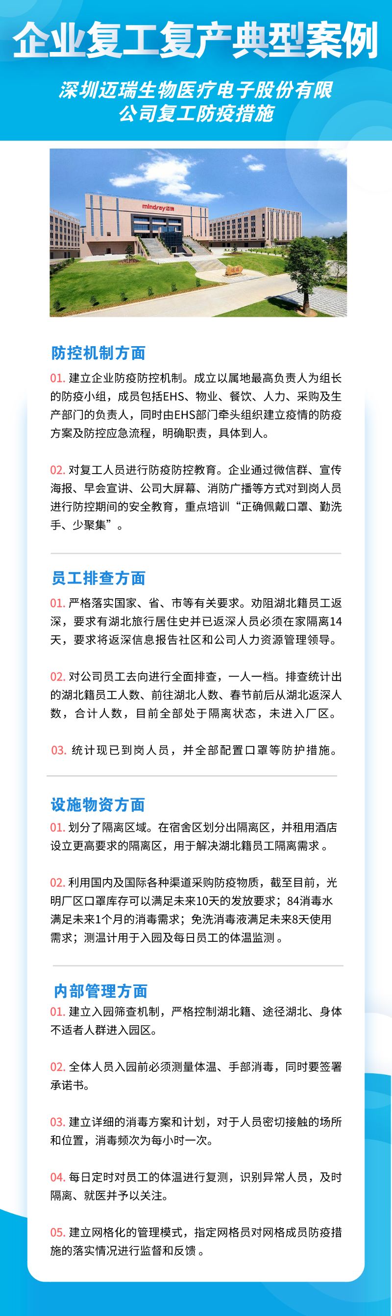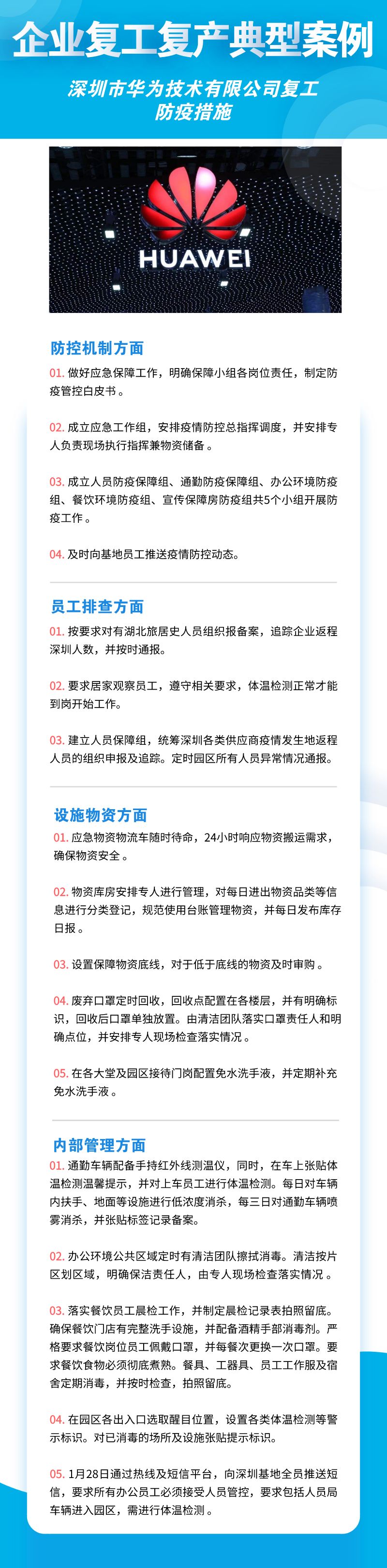 深圳市華為技術(shù)有限公司、聯(lián)想系統(tǒng)集成(深圳)有限公司、深南電路股份有限公司、比亞迪股份有限公司、創(chuàng)維集團(tuán)股份有限公司等8家公司,從防控機制、員工排查、設(shè)施物資、內(nèi)部管理四個方面來落實疫情防控措施,包括成立企業(yè)疫情防控小組、建立企業(yè)防控機制、提升員工防控意識、劃分隔離區(qū)域、宿舍食堂等區(qū)域消殺等舉措。