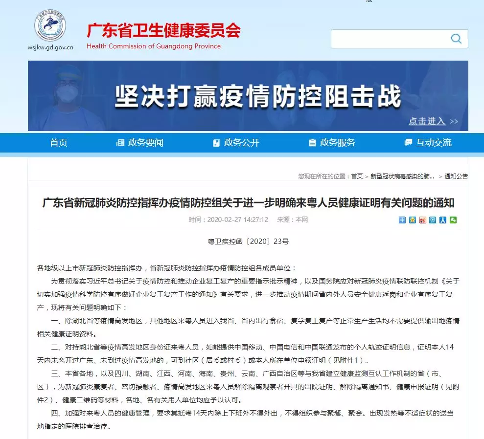 廣東省新冠肺炎防控指揮辦疫情防控組關于進一步明確來粵人員健康證明有關問題的通知