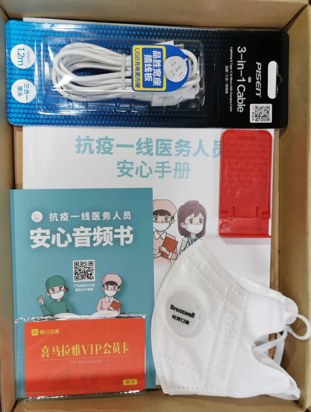 這是一個(gè)20x28cm2的普通牛皮紙紙盒,里面最顯眼的,是一本《安心手冊(cè)》,一張“抗疫一線(xiàn)醫(yī)務(wù)人員安心音頻書(shū)”卡,一張音頻APP的有聲書(shū)卡,和兩個(gè)N95口罩。此外,筆記本、筆、手機(jī)充電線(xiàn)、手機(jī)支架,也都細(xì)心地配全了。紙盒旁還放著一個(gè)小巧玲瓏的智能聲控音箱,使用者“不沾手”就能使用,防止病毒傳播。小東西里,也藏著大關(guān)愛(ài)。