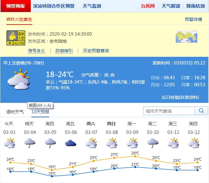 見圳客戶端·深圳新聞網2020年3月3日訊 據市氣象臺預測,3月3日深圳多云;氣溫17-20℃;偏東風3級,陣風5-6級;能見度5-15公里。早晨體感偏涼,注意添衣。