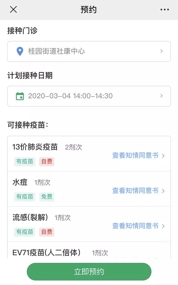 2.成功關(guān)聯(lián)寶寶后,點(diǎn)擊立即預(yù)約,選擇接種機(jī)構(gòu)及計(jì)劃接種日期,查看可接種疫苗的針次及疫苗庫存,確認(rèn)無誤后立即預(yù)約。