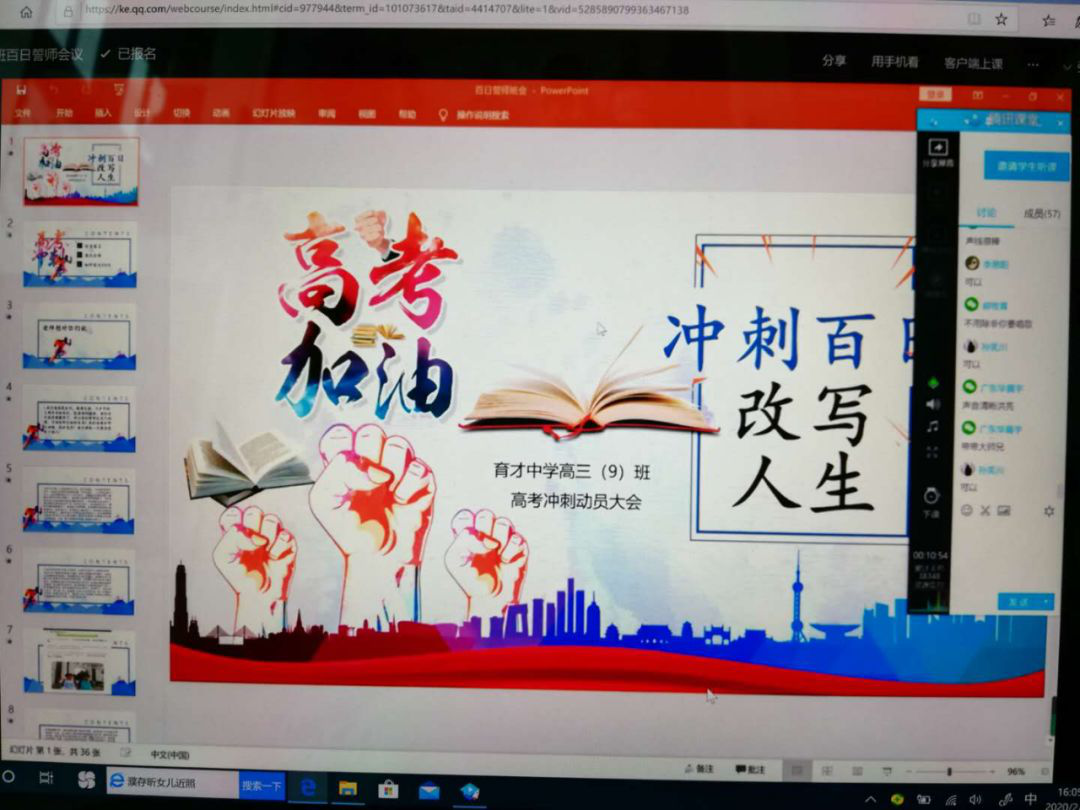 2月28日,橫崗高級中學2020屆高三全體師生利用騰訊課堂召開以班級為單位的網(wǎng)上“高考百日誓師大會”。各班精心制作PPT,提前錄制老師、家長、同學的祝福小視頻,科任老師、學生家長、學生代表連麥鼓勵,同學們最后對著電子屏幕高喊百日誓詞同時下定決心,為自己的夢想,刻苦拼搏,永不言悔。網(wǎng)上“百日誓師”豪情滿懷、溫情涌動、感人至深。