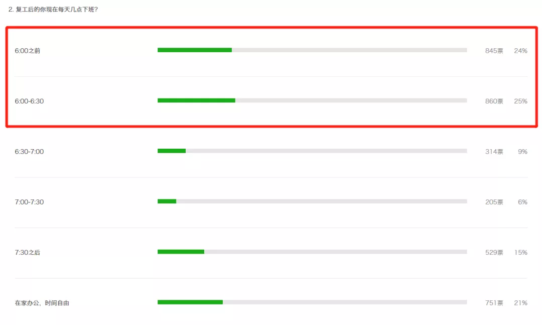 而復(fù)工后,大多人都集中在18時(shí)30分前下班。其中,18時(shí)前下班的占24%,18時(shí)至18時(shí)30分下班的占25%。