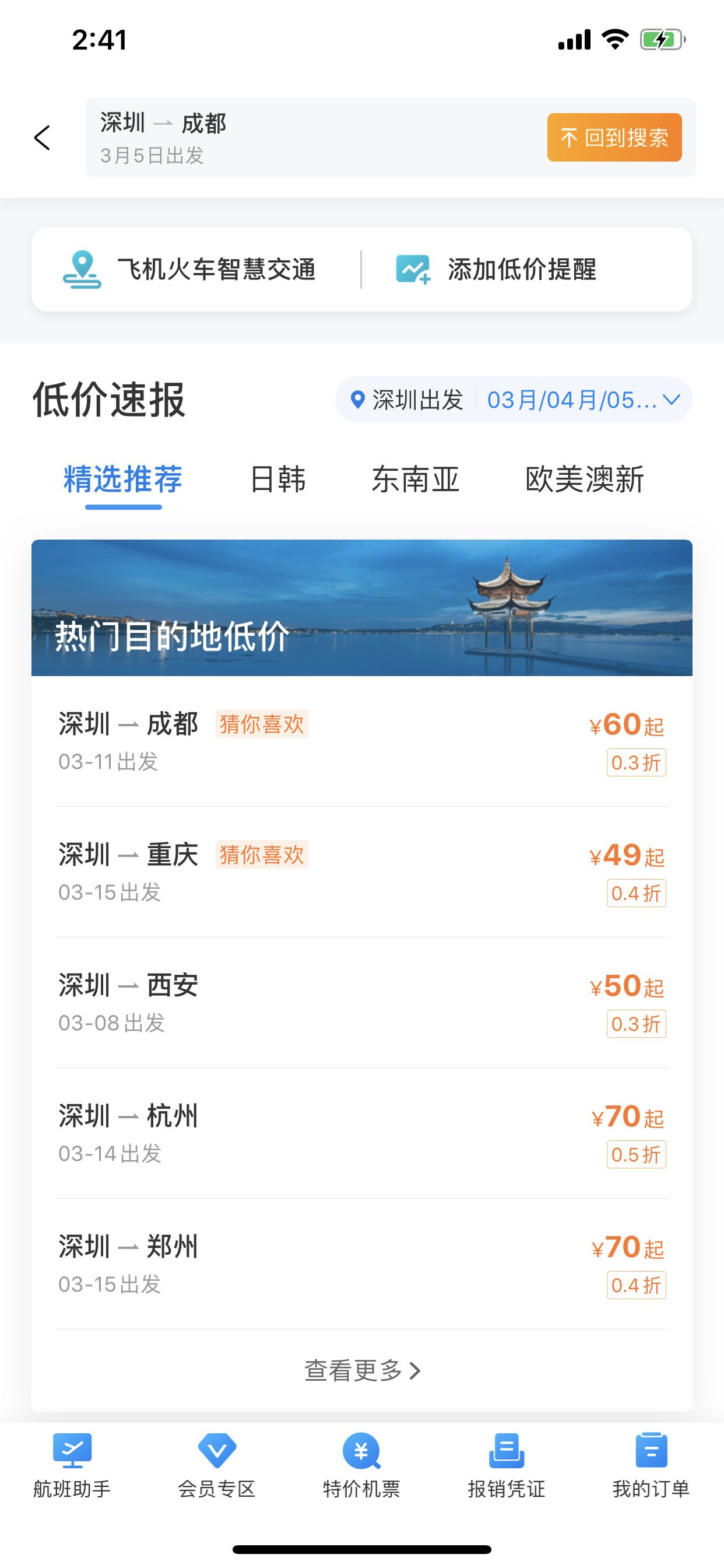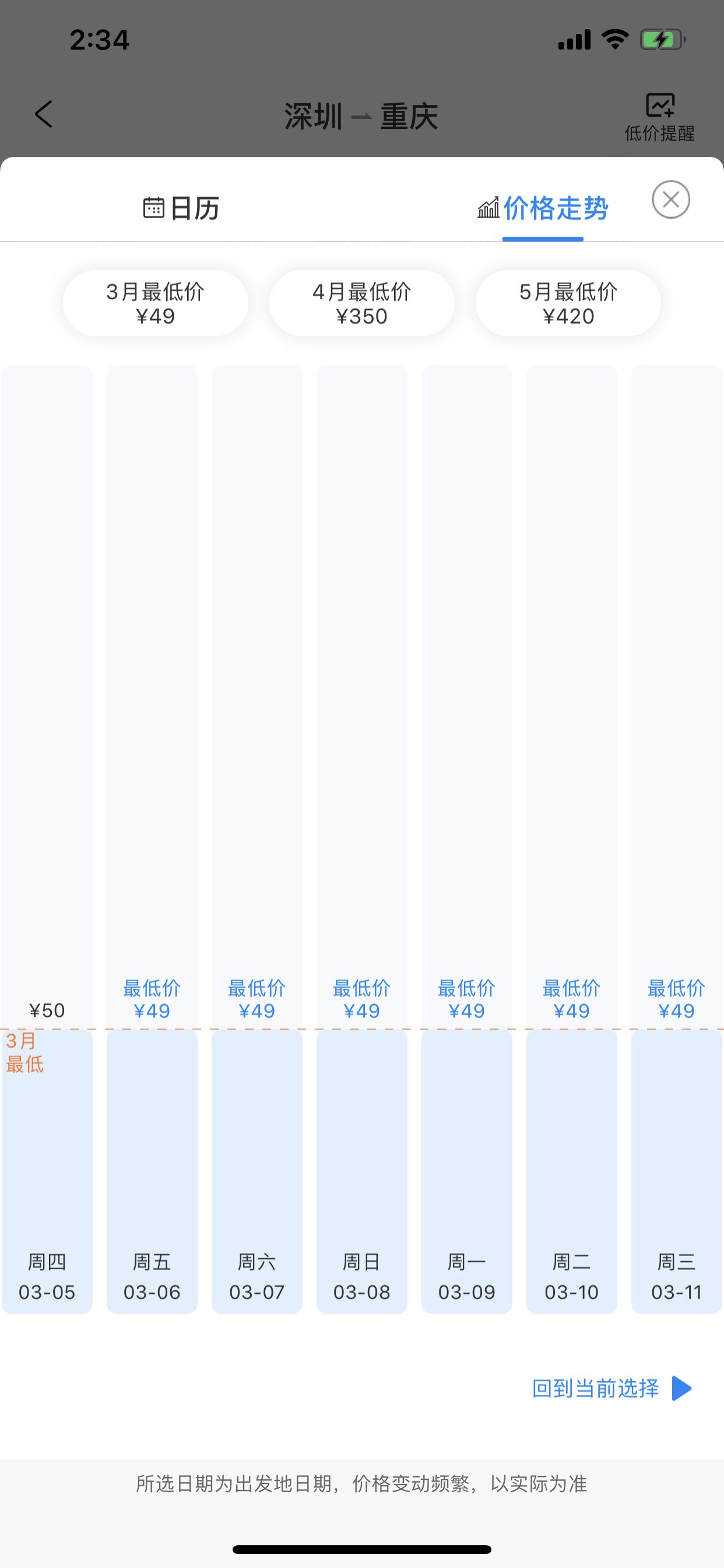 3月5日,記者在飛豬、攜程等第三方機票預訂平臺看到,近日從深圳飛往重慶、成都等地的多條航線,兩位數(shù)的“白菜價”機票比比皆是,如深圳飛重慶機票本身價格才49元,低價一直持續(xù)到3月底。一平臺客服告訴記者,票價真實,這是航空公司的定價。