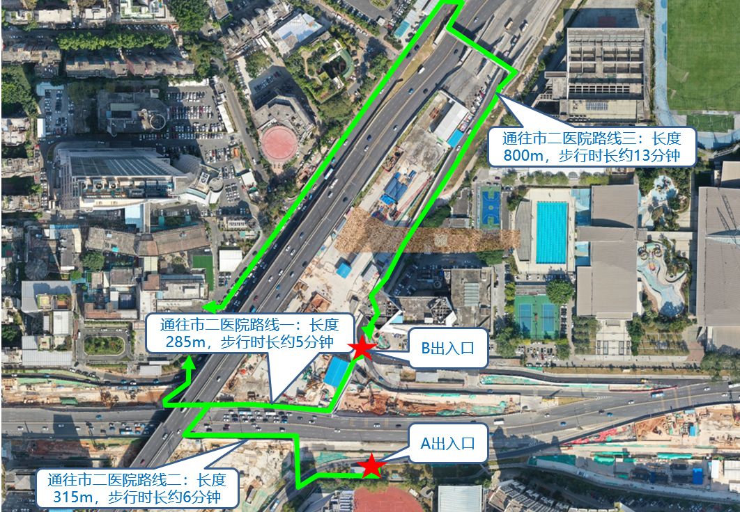 1.去往市二醫(yī)院的市民可從地鐵黃木崗站B出入口出站,沿地面新建的風(fēng)雨連廊到達(dá)(步行時間約5分鐘)。(詳見圖1)