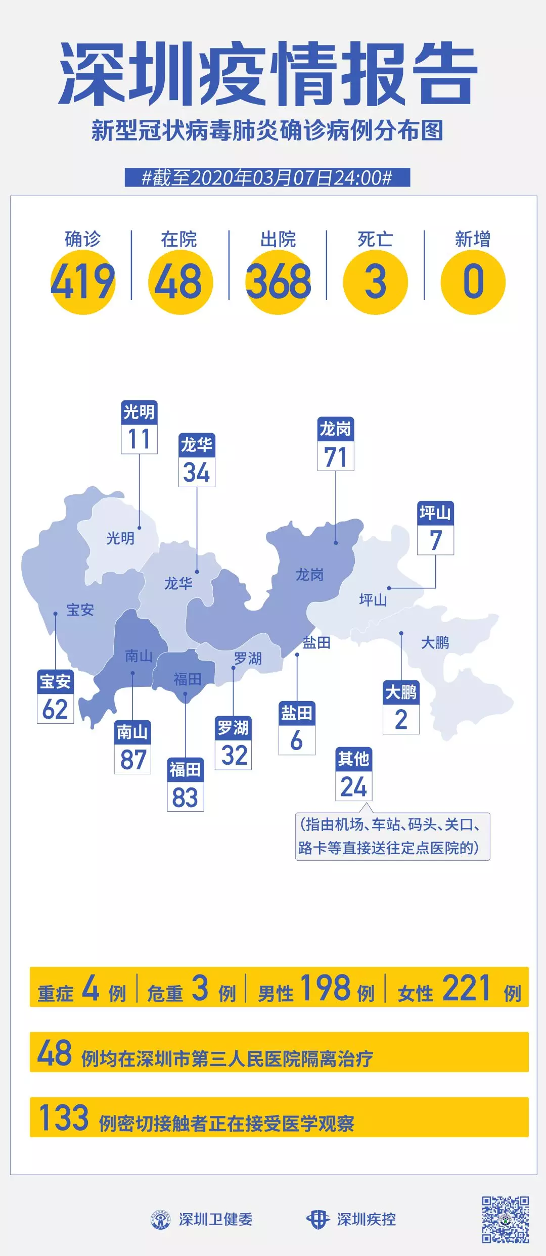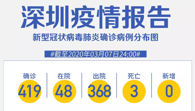 截至3月7日24時,深圳累計報告“新冠肺炎”確診病例419例。3月7日當天全市無新增確診病例,當天出院病例7例(從2月26日起不再公布出院個案)。
