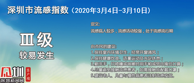 見(jiàn)圳客戶端·深圳新聞網(wǎng)2020年3月9日訊(見(jiàn)圳客戶端、深圳新聞網(wǎng)記者 劉夢(mèng)婷)根據(jù)深圳市疾控中心公布的深圳市流感指數(shù),3月份以來(lái),深圳均顯示為Ⅲ級(jí)(較易發(fā)生),目前深圳處于流感流行期,流感活動(dòng)較強(qiáng),流感病人較多。