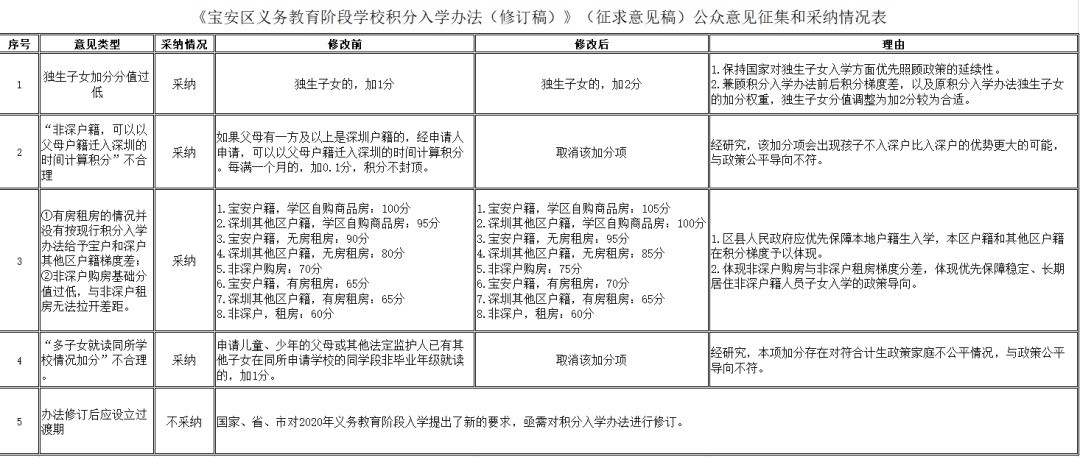 在新修訂稿中,寶安區(qū)教育局結(jié)合市民意見反饋,擬將獨(dú)生子女加分由1分調(diào)整至2分,并取消兩項(xiàng)加分項(xiàng),同時(shí)對部分情況分值進(jìn)行調(diào)整,以體現(xiàn)積分梯度。