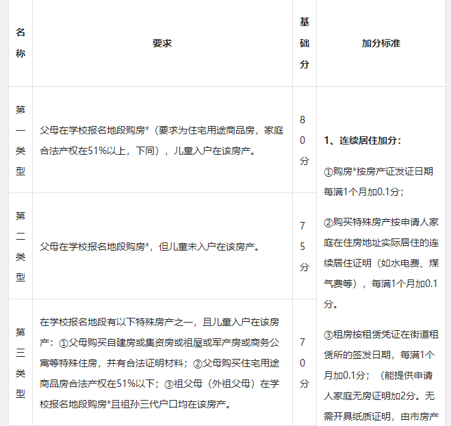 租房:父母、祖父母、外祖父母或法定監(jiān)護(hù)人在申請學(xué)校學(xué)區(qū)內(nèi)租房且能提供《房屋租賃憑證》或《公共租賃房合同》,按簽發(fā)日期每滿一個(gè)月加0.1分,其他類住房不積分。