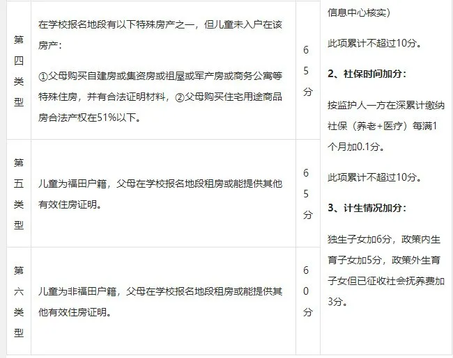 此外,"寶安戶籍,學(xué)區(qū)自購商品房"、"深圳其他區(qū)戶籍,學(xué)區(qū)自購商品房"、"寶安戶籍,無房租房"、"深圳其他區(qū)戶籍,無房租房"、"非深戶購房"、"寶安戶籍,有房租房"等情況分別在原有基礎(chǔ)分上另加5分。