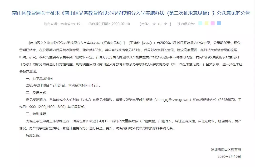 1月19日,南山區(qū)教育局第一次征求意見發(fā)出后,共收集到關(guān)于積分算法調(diào)整的反饋意見182條,并于2月10日第二次發(fā)布《南山區(qū)義務(wù)教育階段公布學(xué)校積分入學(xué)實施辦法》征求意見稿(以下簡稱《意見》),根據(jù)《意見》內(nèi)容,擬調(diào)整2020年積分入學(xué)辦法。