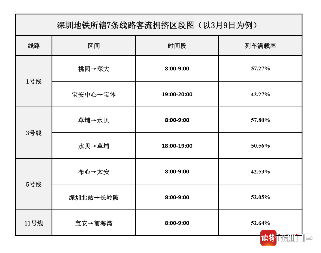 與此同時,深圳地鐵也對近期各線路區(qū)段的客流變化規(guī)律進行了全面分析。數(shù)據(jù)顯示,地鐵列車滿載率超過40%的時段(指實際列車載客人數(shù)占比為額定載客人數(shù)的4成以上),主要集中在早上8:00至9:00之間。其中,1號線固戍至深大區(qū)段、3號線丹竹頭至老街區(qū)段、5號線民治至西麗區(qū)段和長龍至太安區(qū)段、11號線橋頭至后海區(qū)段的客流均相對較大。市民乘客在高峰期如需搭乘地鐵,可留意各線路區(qū)段的擁擠情況,提前合理規(guī)劃乘車路線、錯峰出行。