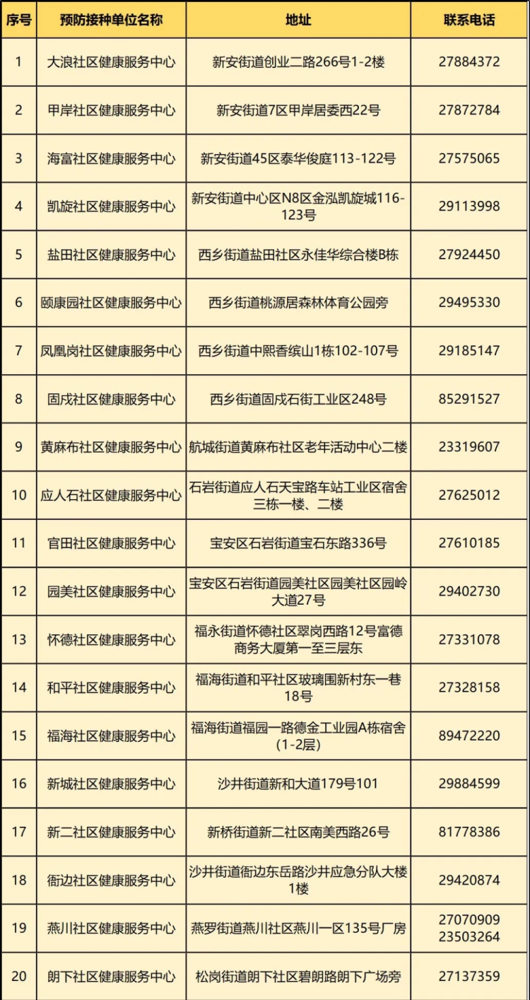 △寶安區(qū)提供預(yù)防接種服務(wù)的20家社區(qū)健康服務(wù)中心名單。