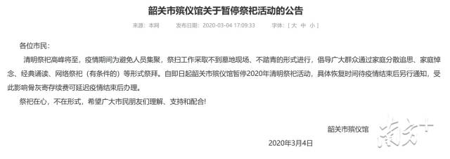 據(jù)統(tǒng)計,截至3月15日17時,深圳、汕頭、中山等地發(fā)文明確,全市暫停祭掃服務,倡導通過家庭追思、網(wǎng)絡祭掃、書寫寄語等方式遙祭先人、慎終追遠。此外,韶關市殯儀館暫停2020年清明祭祀活動。