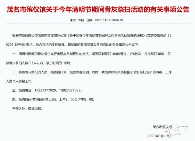 茂名市殯儀館提供限制性祭掃服務,清明節(jié)期間的骨灰祭掃實行電話實名制預約,每天限制祭掃180份骨灰,分6批次;每批祭掃30份,每份骨灰祭掃人數(shù)在3人以內(nèi),祭掃時間為1小時。