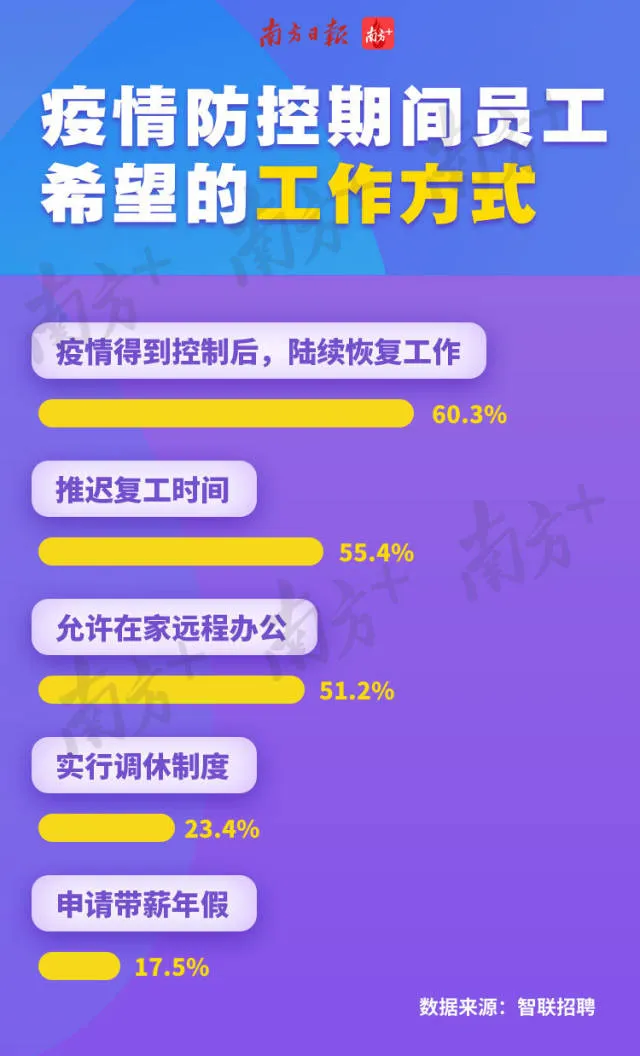 其中,60.3%的職場(chǎng)人希望疫情得到控制后再陸續(xù)復(fù)工,盡管這種理想狀況可能性不大,也有55.4%的職場(chǎng)人希望推遲復(fù)工時(shí)間,51.2%的職場(chǎng)人呼吁遠(yuǎn)程辦公。