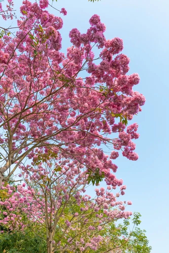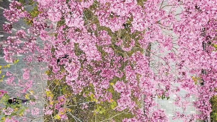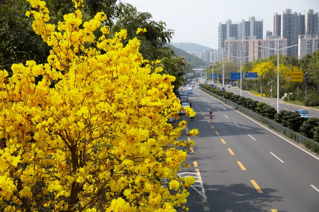 寶安航城街道機(jī)場(chǎng)南路兩旁,風(fēng)鈴木花綻放。