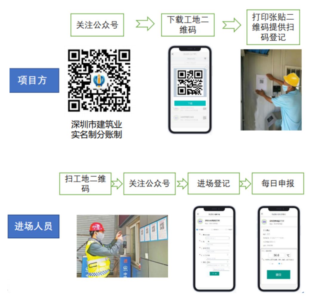 市場(chǎng)建設(shè)單位應(yīng)關(guān)注深圳市建筑業(yè)實(shí)名制分賬制微信公眾號(hào),獲取本工地的微信二維碼,并將工地二維碼張貼至工地公示區(qū)域。施工人員每日進(jìn)場(chǎng)前測(cè)溫后,掃碼申報(bào)個(gè)人測(cè)溫結(jié)果和健康狀況。