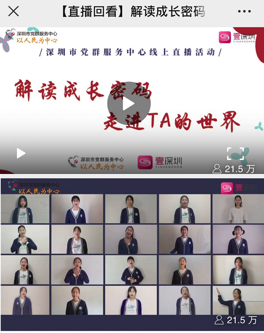 見圳客戶端、深圳新聞網(wǎng) 2020年3月19日訊(記者 陳彬) 3月15日下午,中共深圳市委組織部和深圳廣播電影電視集團(tuán)聯(lián)合在壹深圳客戶端推出深圳市黨群服務(wù)中心線上直播活動(dòng),播出深圳市第二實(shí)驗(yàn)學(xué)校花語合唱團(tuán)“云合唱”作品《奉獻(xiàn)》,截止3月18日,線上點(diǎn)擊量達(dá)到21.5萬 。