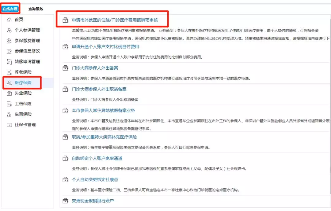 點(diǎn)擊“在線辦理”→點(diǎn)擊“醫(yī)療保險”→點(diǎn)擊“申請市外就醫(yī)的住院/門診費(fèi)用報銷預(yù)審核”