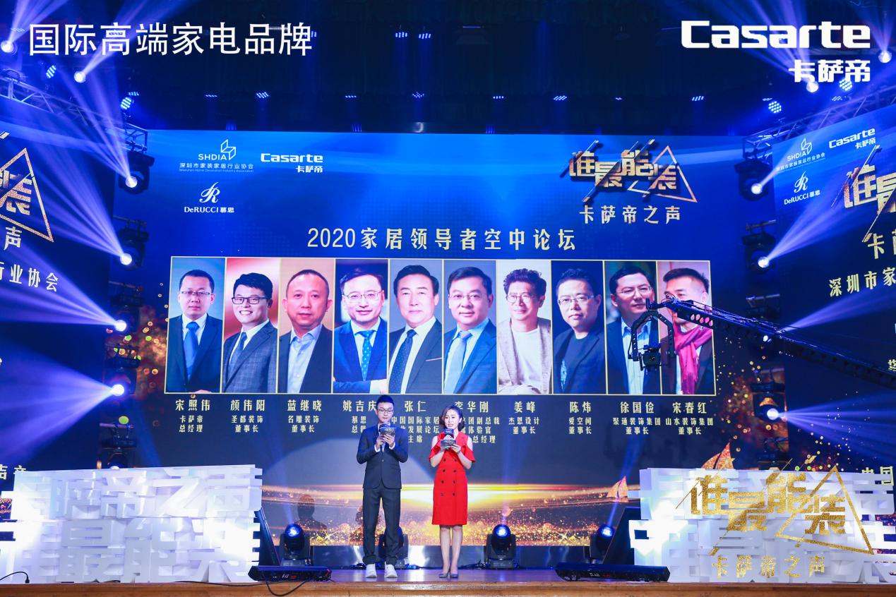 在疫情影響下,以《卡薩帝之聲——誰最能“裝”》為主題的中國家裝行業(yè)領(lǐng)袖年度演講以空場的形式進(jìn)行,主辦方同時舉行了2020家居領(lǐng)導(dǎo)者空中論壇。中國國際家居產(chǎn)業(yè)發(fā)展論壇主席張仁,海爾集團副總裁、首席體驗官、中國區(qū)總經(jīng)理李華剛,中國室內(nèi)設(shè)計第一股、杰恩設(shè)計董事長姜峰,慕思總裁姚吉慶,上市裝企名雕董事長藍(lán)繼曉,愛空間董事長陳煒,中國室內(nèi)裝飾行業(yè)協(xié)會副會長、上海聚通裝飾集團董事長徐國儉,國際高端家電品牌卡薩帝總經(jīng)理宋照偉,杭州圣都裝飾集團董事長顏偉陽,安徽山水裝飾集團董事長宋春紅等來自全國泛家居領(lǐng)域的十位領(lǐng)袖空中助力,通過視頻方式來推動家居行業(yè)發(fā)展。