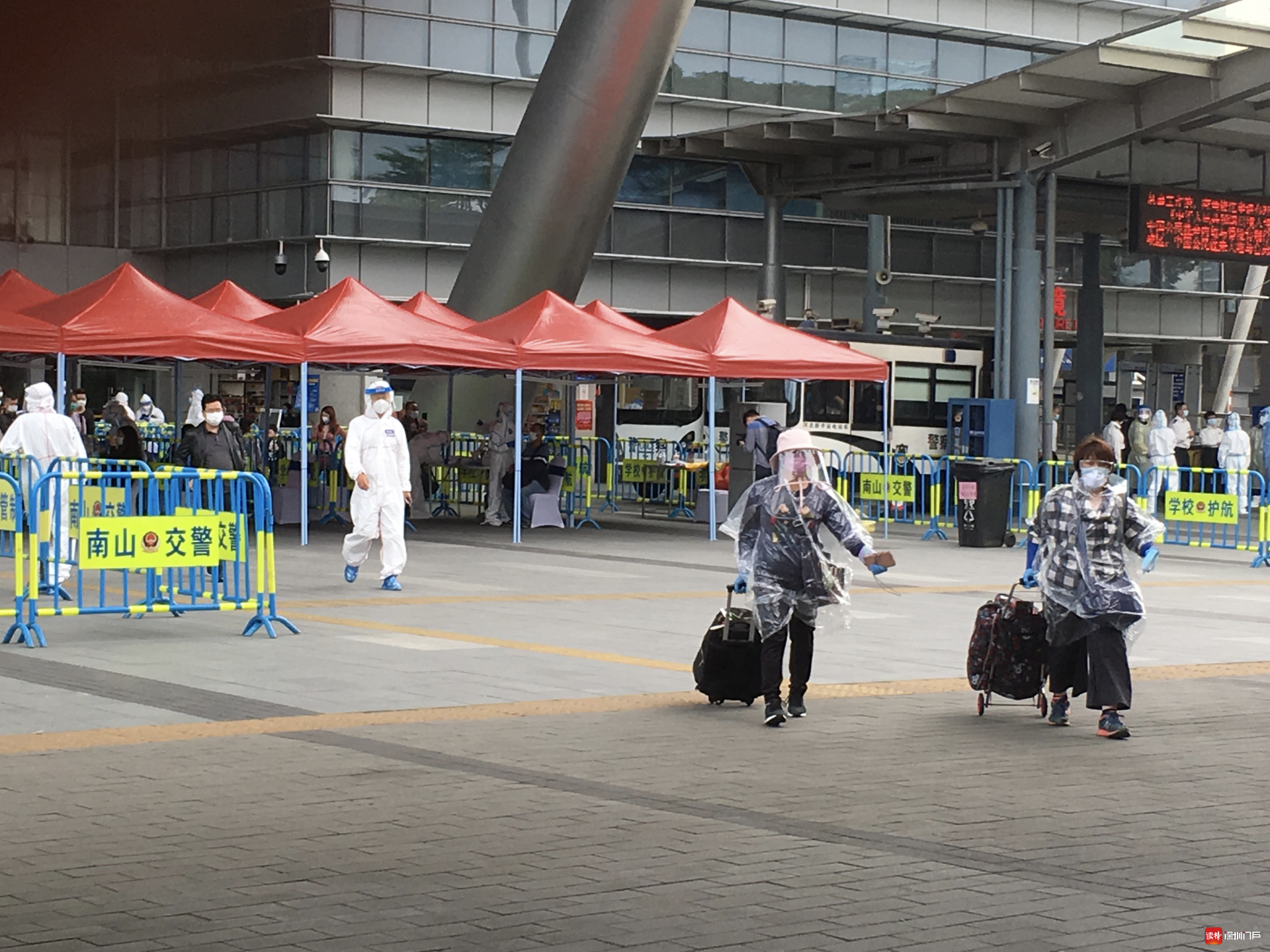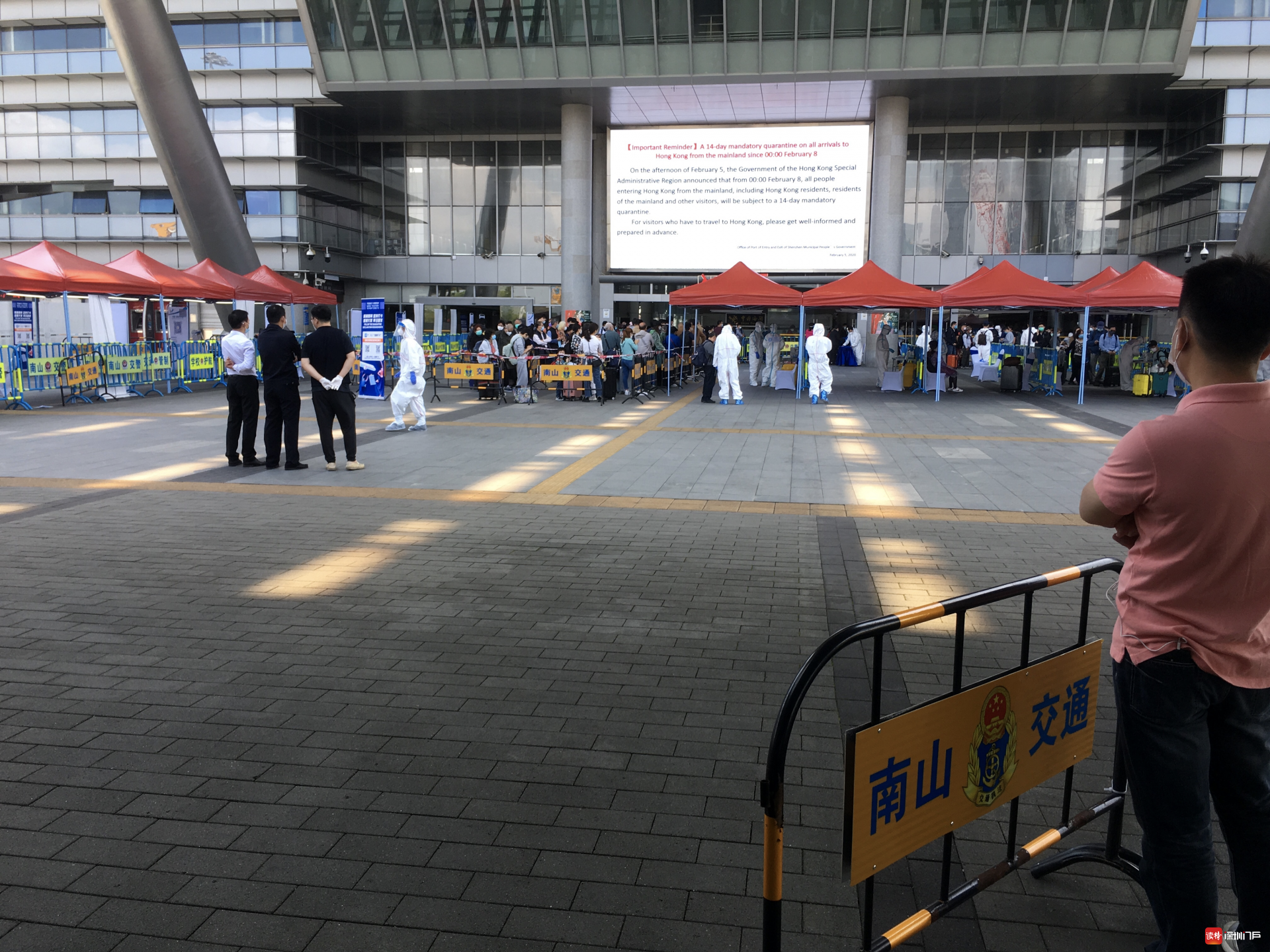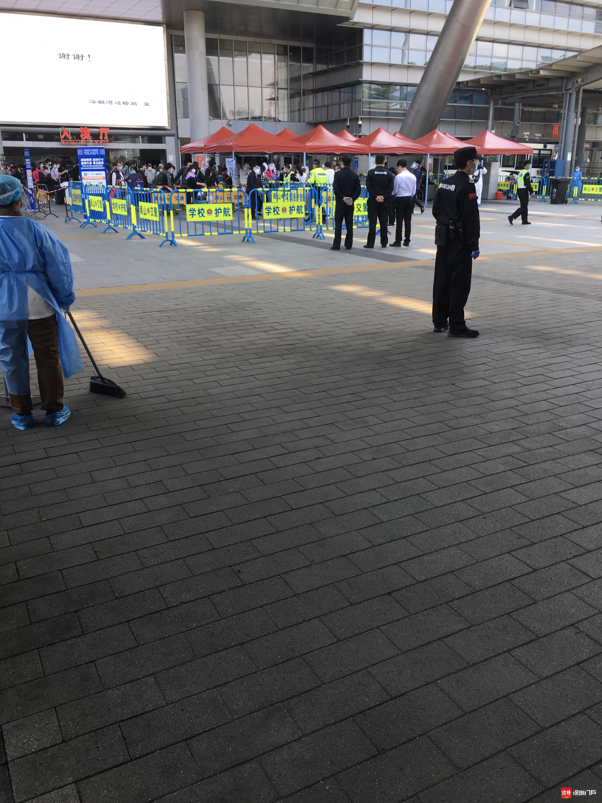 “排隊(duì)排了好幾個(gè)小時(shí),終于出來了!”頭戴帽子、護(hù)目鏡和口罩,外加一襲透明“雨衣”的趙女士把自己包裹得嚴(yán)嚴(yán)實(shí)實(shí),走到深圳灣口岸北廣場外才把帽子摘了,額頭微微出汗。她告訴記者,上午10點(diǎn)鐘她從香港出境,直到下午2點(diǎn)才通關(guān)。香港居民鐘先生是一名大學(xué)生,因老家有事才入境,他比趙女士要幸運(yùn)一些,從11點(diǎn)開始通關(guān)的他花了2個(gè)多小時(shí)。
