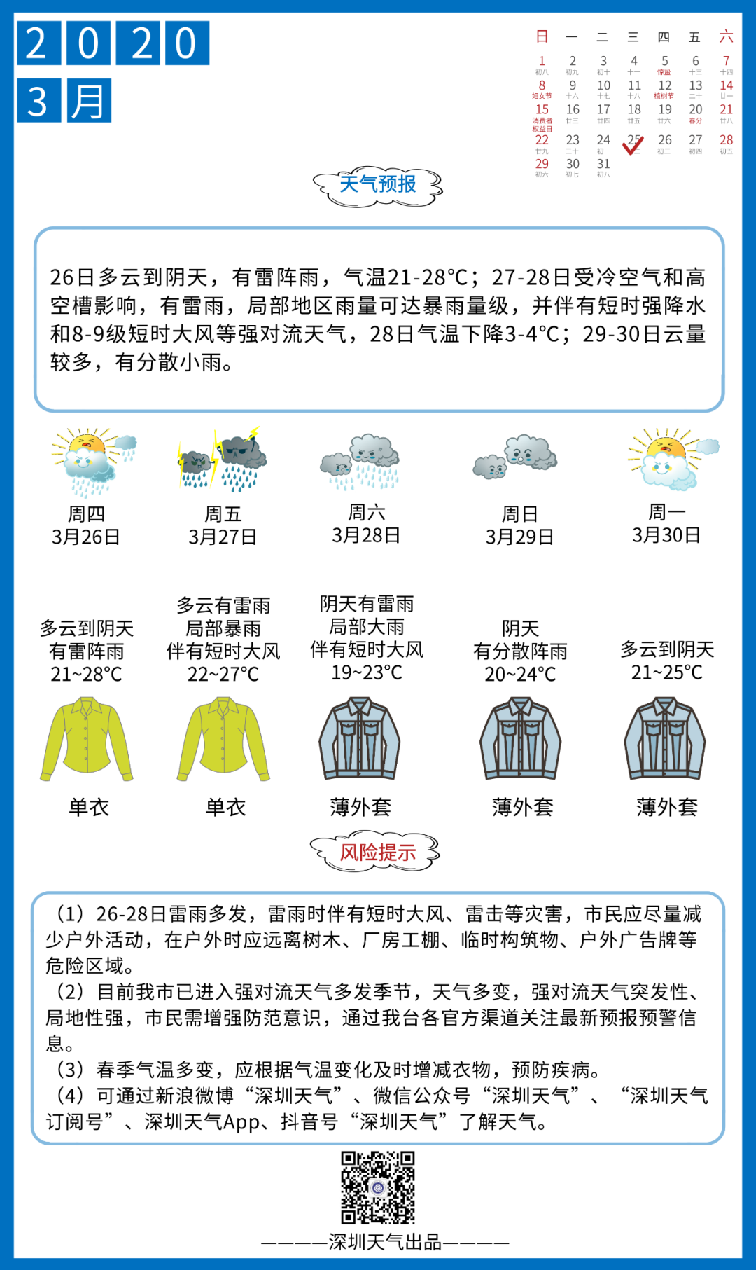 26-28日,深圳雷雨頻繁;26日天氣漸趨不穩(wěn)定,有雷陣雨;27-28日受高空槽、切變線南壓影響,雷雨頻密,局部地區(qū)可達(dá)暴雨,伴短時強降水、8-9級短時大風(fēng)和強雷暴等強對流天氣;28日降水趨于減弱。