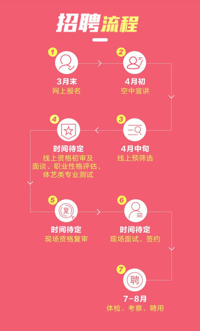 據(jù)悉,此次招聘將于3月末啟動網(wǎng)上報名,4月初進行"空中"宣講,4月中旬進行線上預(yù)篩選,此后還將有線上資格初審及面談、職業(yè)性格評估、體藝類專業(yè)測試、現(xiàn)場資格復(fù)審等環(huán)節(jié),錄用者將于7至8月進行體檢、考察聘用。