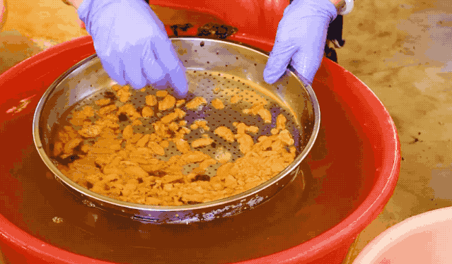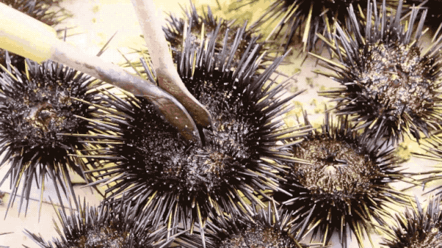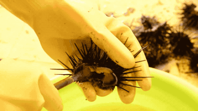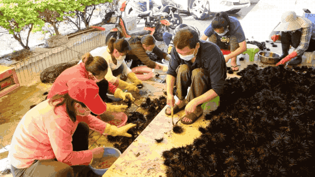 記者來到大鵬新區(qū)南澳海港路的潤成海膽專賣店,看到工人們上下飛舞著鐵鉤“挖海膽”。南澳本地人口中所謂“挖海膽”就是海膽加工,打開海膽殼,把海膽肉取出來,然后用海水清洗干凈。從捕撈到上岸加工處理都必須一天之內(nèi)完成,只有嚴(yán)守時(shí)間的把控,爭分奪秒才配擁有鮮美和誘人的口感。