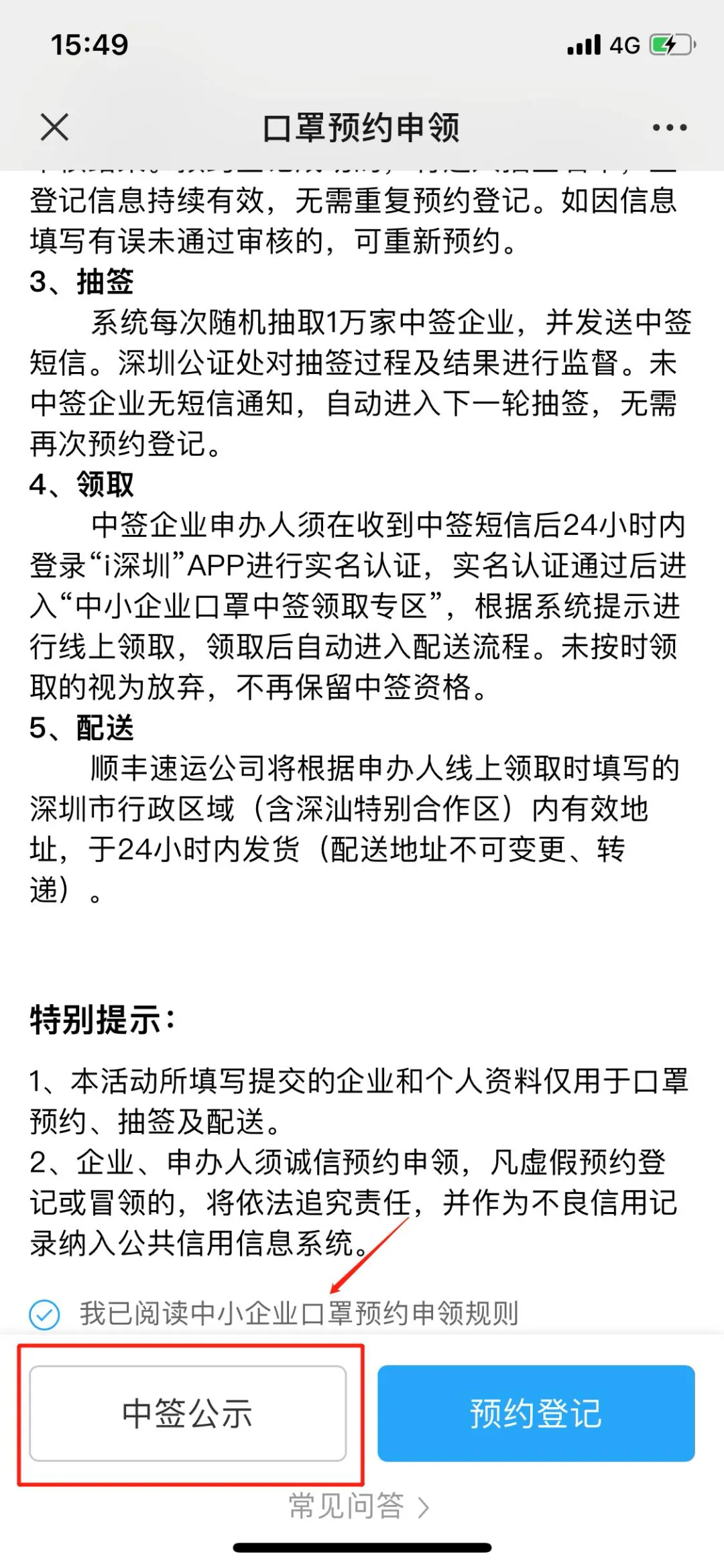 企業(yè)中簽名單:在“i深圳”微信公眾號(hào)首頁-口罩預(yù)約-中小企業(yè)專區(qū)頁面的下方“中簽公示”查看