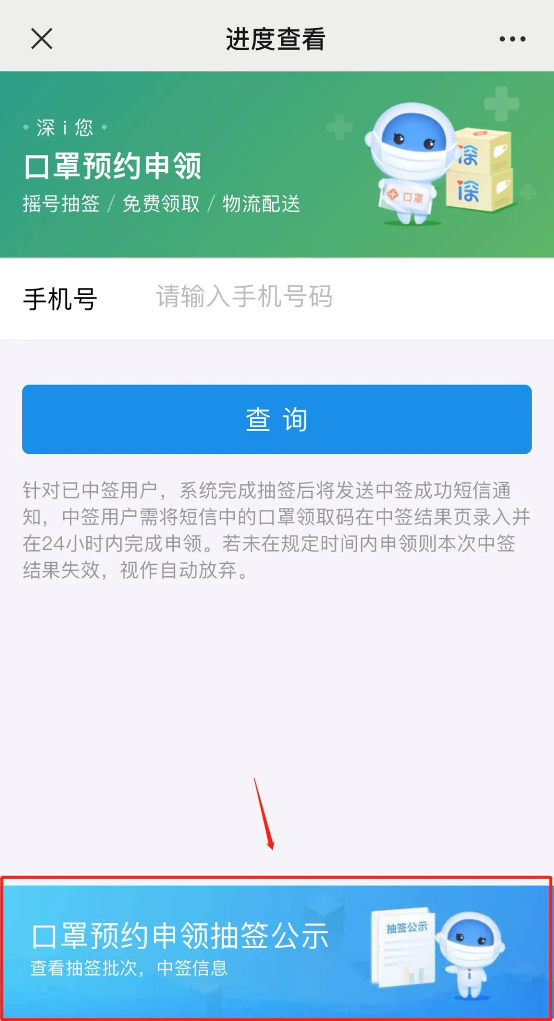 個(gè)人中簽名單:可在“i深圳”微信公眾號(hào)首頁-口罩預(yù)約-市民專區(qū)-進(jìn)度查看的頁面下方“口罩預(yù)約申領(lǐng)抽簽公示”查看