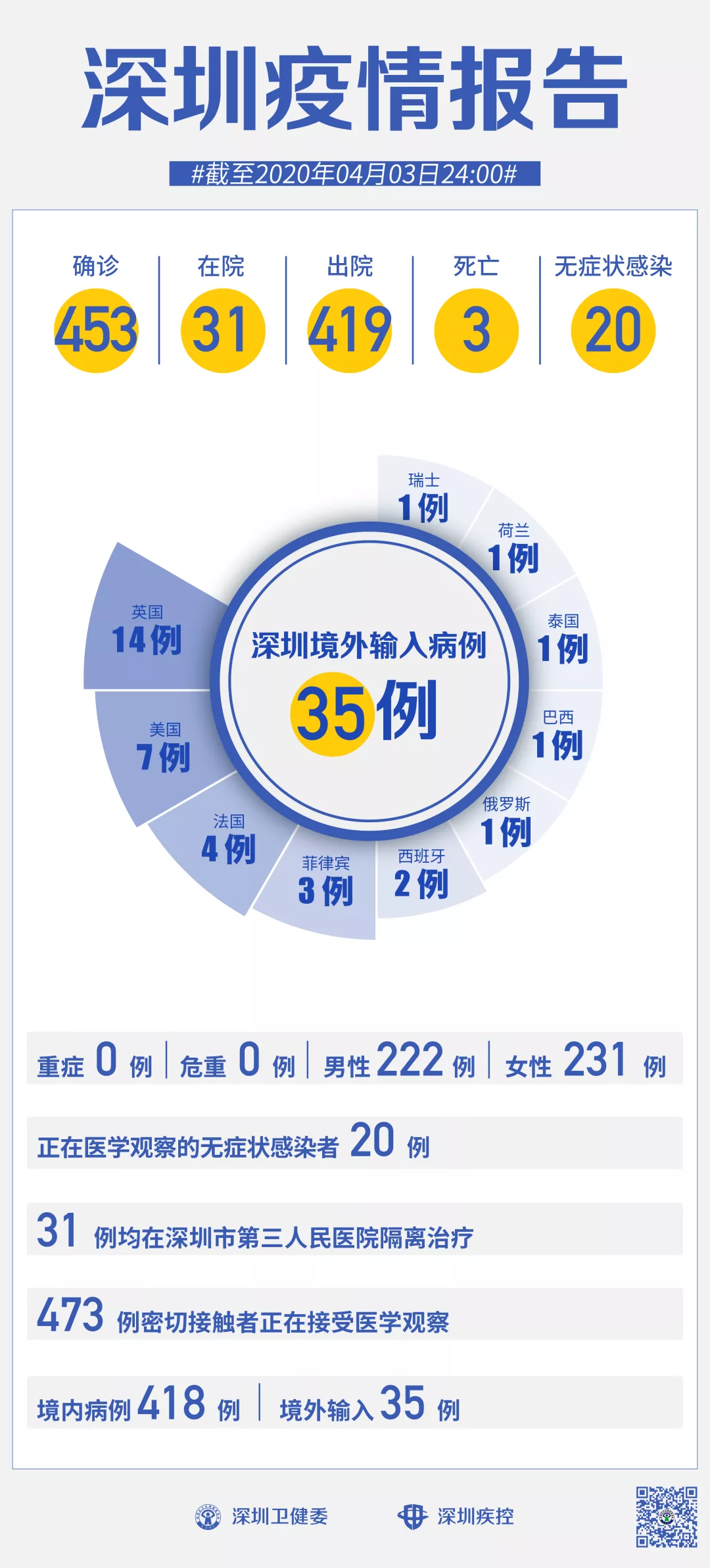 截至4月3日24時(shí),深圳累計(jì)報(bào)告新冠肺炎病例453例。4月3日當(dāng)天新增1例境外輸入病例。