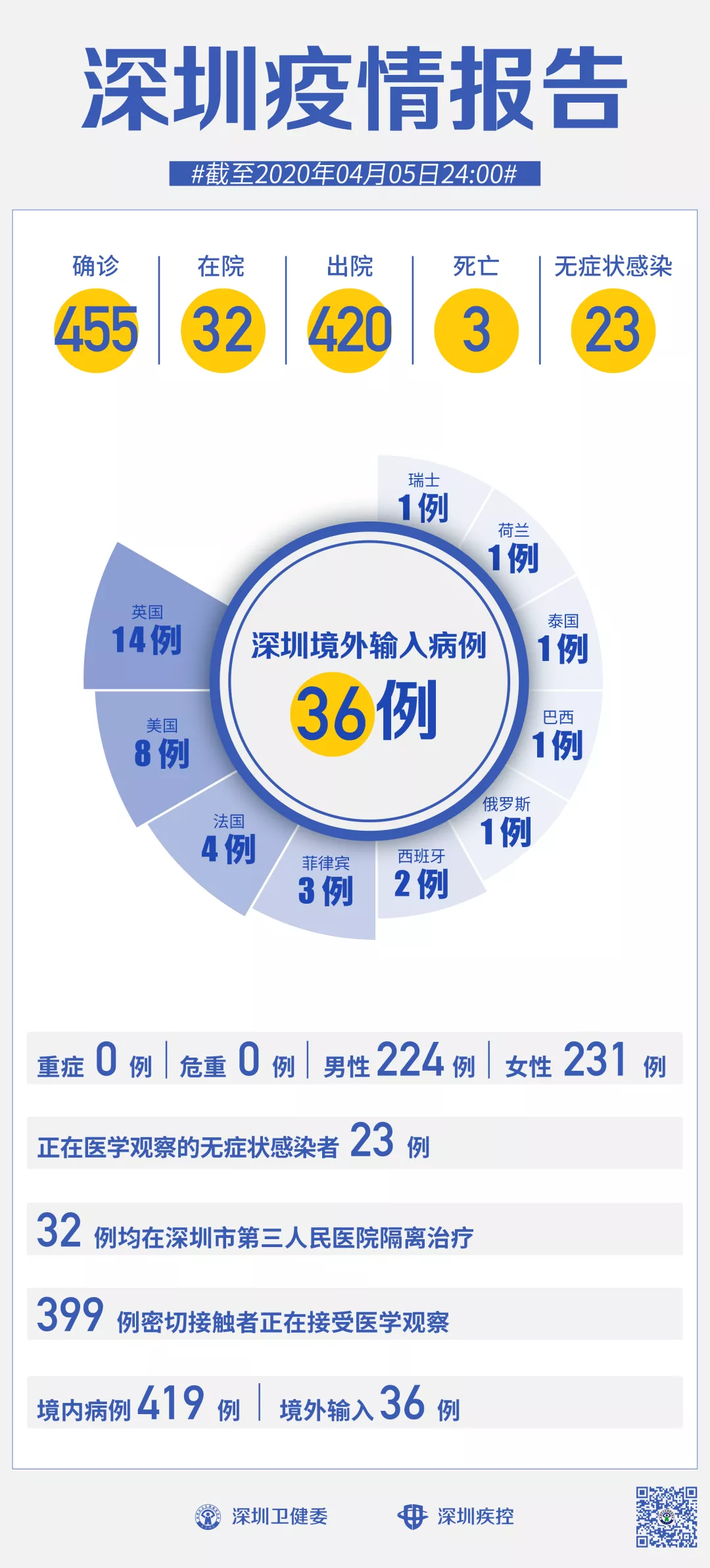 截至4月5日24時(shí),深圳累計(jì)報(bào)告新冠肺炎病例455例。4月5日當(dāng)天新增境內(nèi)病例1例,新增無(wú)癥狀感染者2例,出院1例。